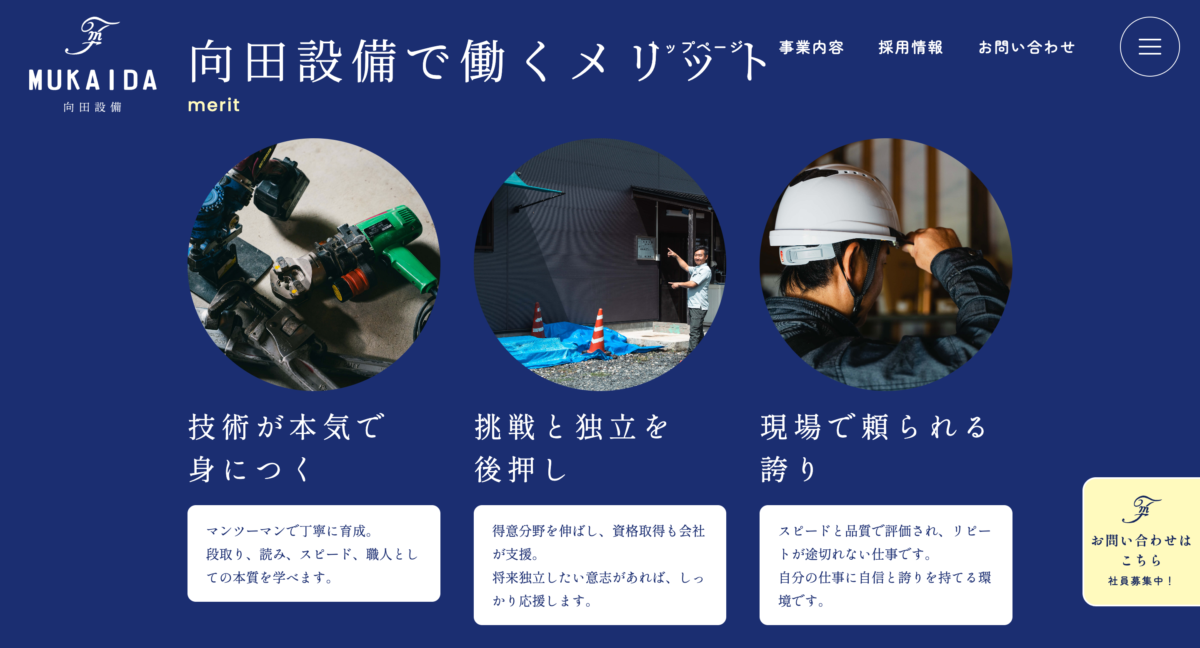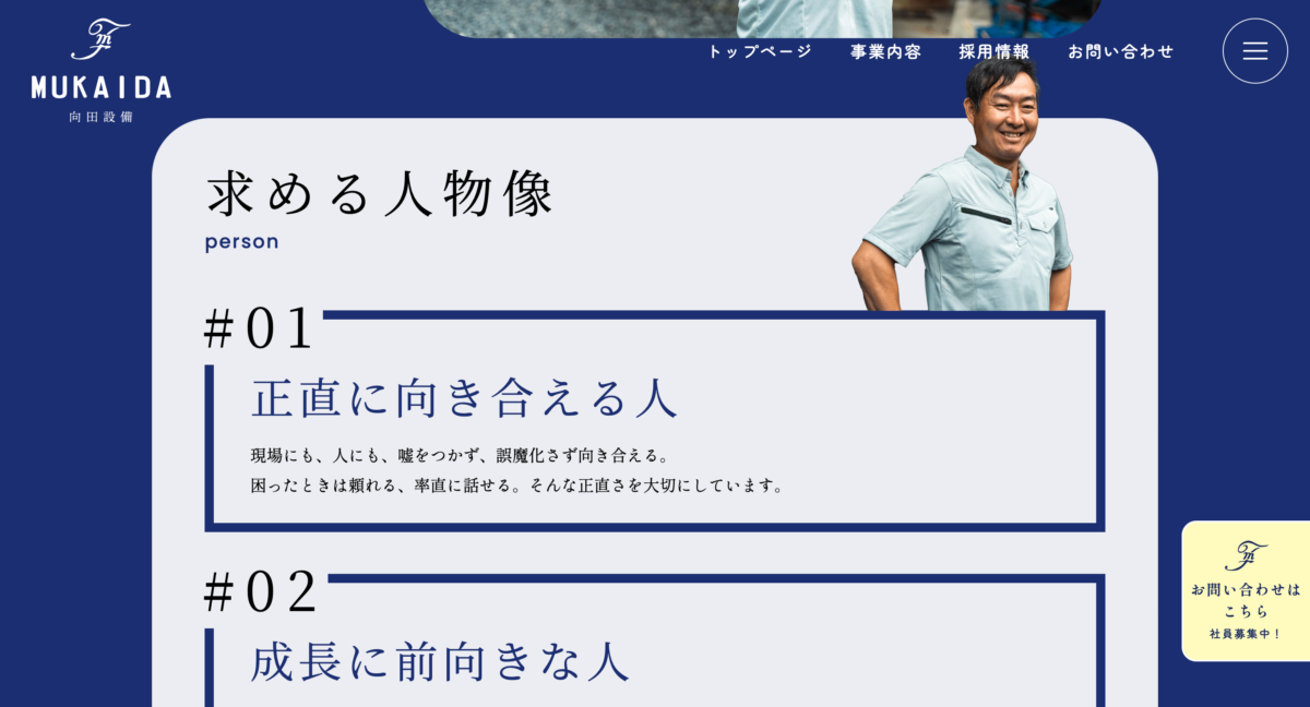 年齢は問わず、若手だけでなく経験者も採用したい。しかし、入社後に「想像していた仕事と違った」と感じて離職してしまうケースをできるだけなくしたい。そのためには、会社の実態や価値観を正しく伝える必要があると考え、コーポレートサイトおよび採用ページの制作をご提案しました。