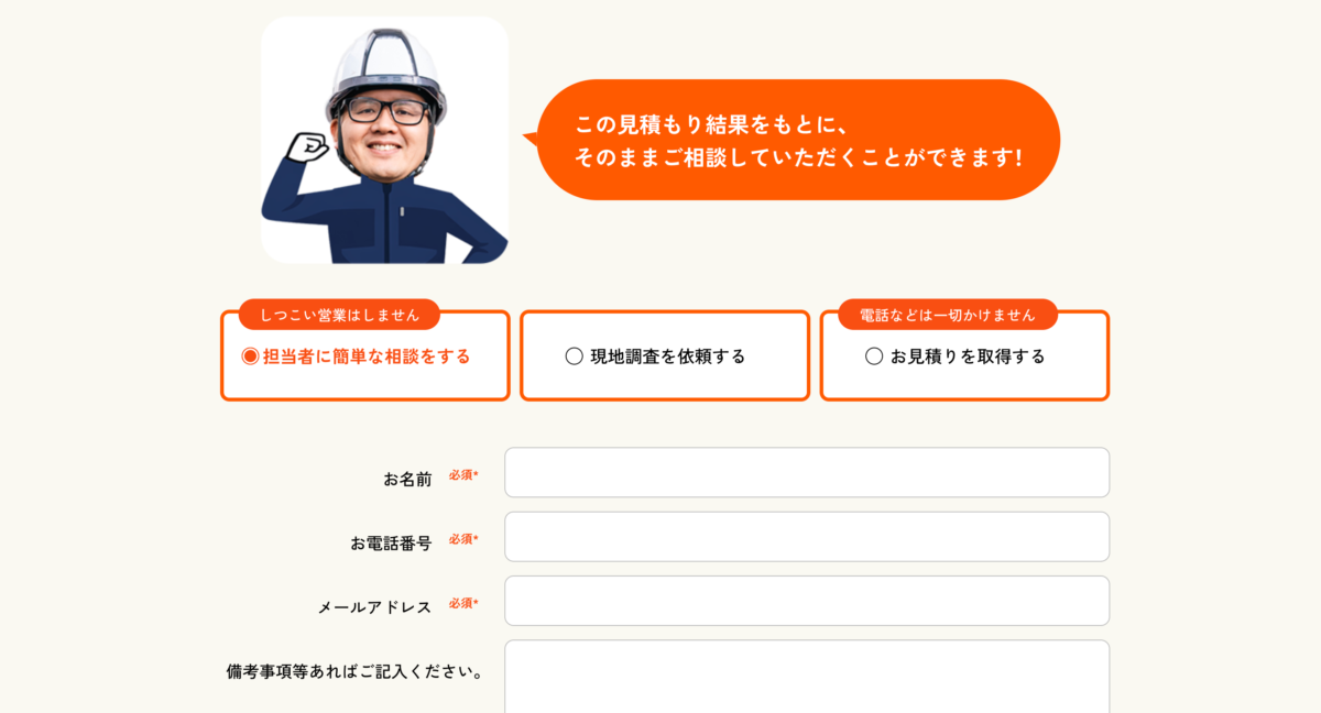 導線設計では、ユーザーの目的に応じて「相談」「現地調査」「見積もり取得」の3つを用意し、それぞれを明確に分岐させることで、行動に繋がりやすい構成としました。また、簡単見積もりフォームを設置し、選択式で概算費用がわかる仕組みを導入。ユーザーが気軽に検討できる環境を整えています。